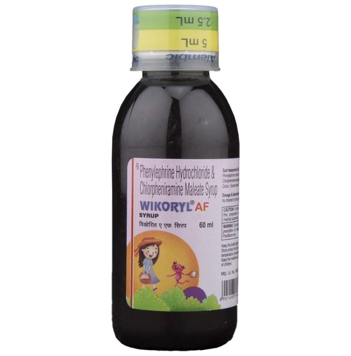 Wikoryl AF Syrup is a combination medicine used in the treatment of common cold symptoms. It relieves allergy symptoms such as runny nose, stuffy nose, sneezing, watery eyes and congestion or stuffiness. Wikoryl AF Syrup is taken with or without food in a dose and duration as advised by the doctor. The dose you are given will depend on your condition and how you respond to the medicine. You should keep taking this medicine for as long as your doctor recommends. If you stop treatment too early your symptoms may come back and your condition may worsen. Let your healthcare team know about all other medications you are taking as some may affect, or be affected by this medicine. The most common side effects are nausea, vomiting, and headache. Most of these are temporary and usually resolve with time. Contact your doctor straight away if you are at all concerned about any of these side effects. This medicine may cause dizziness and sleepiness, so do not drive or do anything that requires mental focus until you know how this medicine affects you. Avoid drinking alcohol while taking this medicine as it can worsen your sleepiness. Never support self-medication or recommend your medicine to another person. It is beneficial to have plenty of fluids while taking this medication. Before you start taking this medicine it is important to inform your doctor if you are suffering from liver disease. You should also tell your doctor if you are pregnant, planning pregnancy or breastfeeding.