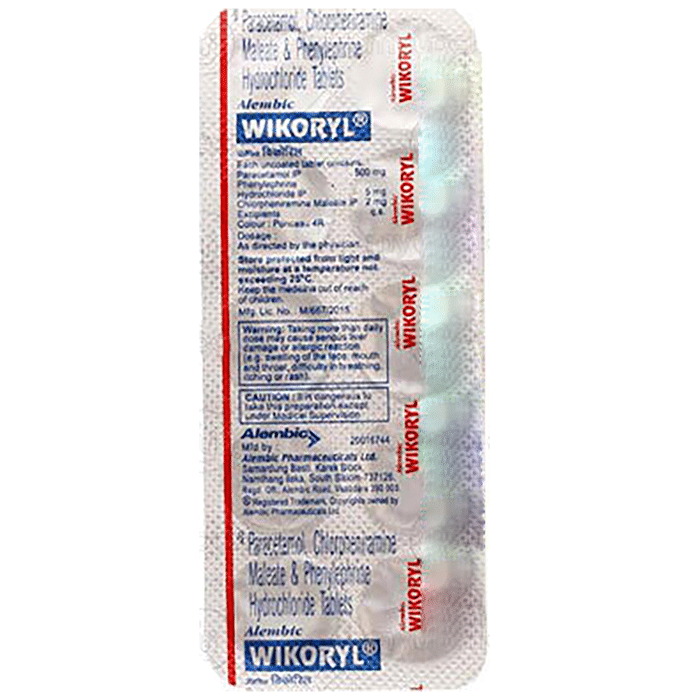 Wikoryl Tablet is a medicine used in the treatment of common cold symptoms. It provides relief from symptoms such as headache, sore throat, runny nose, muscular pain, and fever. Wikoryl Tablet can be taken with or without food. The dose and duration will depend on the severity of your condition. You should keep taking the medicine even if you feel better until the doctor says it is alright to stop using it. Using this medicine may cause a few common side effects such as nausea, vomiting, sleepiness, dizziness, and headache. If any of these side effects do not resolve with time or get worse, you should let your doctor know. Your doctor may be able to suggest ways of preventing or reducing the side effects. In general, you should try to use the smallest amount necessary to control your symptoms. Before using the medicine, you should tell your doctor if you have any other medical conditions or disorders. To make sure it is safe, you should let your doctor know all the other medicines you are taking. Also, tell your doctor if you have any problems with the liver or kidneys. Avoid consumption of alcohol while on treatment with this medicine as it may increase the chance of some side effects. Pregnant and breastfeeding women should consult their doctors first before using the medicine.