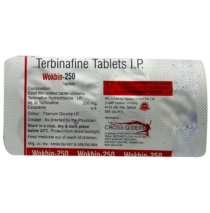 Wokbin 250 Tablet belongs to a group of medicines called antifungals It is used to treat a wide range of fungal infections of the skin and nails, including ringworm. It works by killing the fungi that cause the infection. Wokbin 250 Tablet can be taken with or without food. You should take it regularly as prescribed by your doctor. Taking it at the same time every day will help you to remember to take it. The dose and duration of treatment will depend on what you are being treated for. Do not stop taking it until you have finished the complete course, even when you feel better. If you stop taking this medicine too early, the fungus may continue to grow and the infection may return or worsen. This medicine's most common side effects include rash, headache, nausea, and abnormal liver enzyme. These are usually mild but let your doctor know if they bother you or last more than a few days. Before using it, you should tell your doctor if you are allergic to any antibiotics or have any kidney or liver problems. You should also let your healthcare team know all other medicines you are taking as they may affect, or be affected by this medicine. Pregnant and breastfeeding mothers should consult their doctor before using it. Your doctor will monitor your liver function regularly during treatment.