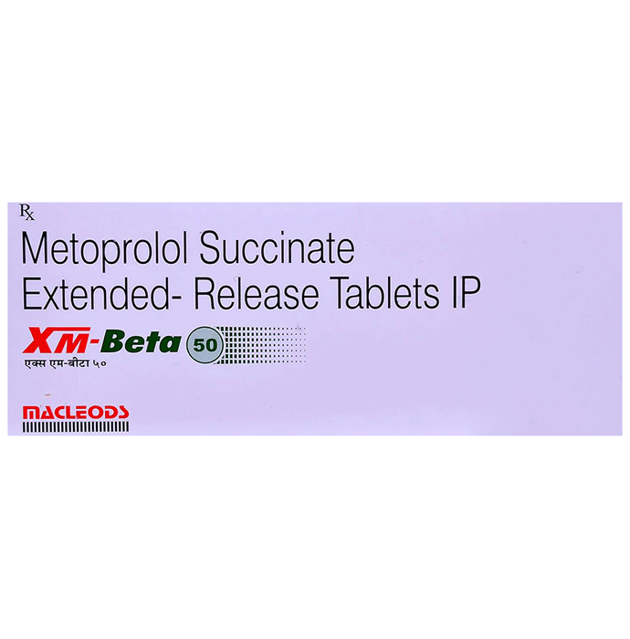 Xmbeta 50mg Tablet belongs to a group of medicines called beta-blockers. It is used to treat high blood pressure (hypertension), angina (heart-related chest pain), irregular heart rhythms (arrhythmia). It also helps to prevent future heart attacks and stroke and to prevent migraines. Xmbeta 50mg Tablet is also used to relieve the symptoms caused by an overactive thyroid gland. It may be prescribed alone or together with other medications. The dose and frequency depend on what you are taking it for and the severity of your condition. It may be taken empty stomach or with a meal, but take it regularly at the same time each day to get the most benefit. It may take several weeks before you get the full benefit of this medicine and you may need to take it for the rest of your life. However, it is important to continue taking it even if you feel well. Most people with high blood pressure do not feel ill and if you stop taking it, your condition may worsen. The main side effects of this medicine are sudden lowering of blood pressure, slow heart rate, headache, feeling dizzy, and nausea. These are usually mild and short-lived. It may also cause shortness of breath or low blood pressure in some people. To reduce the risk of side effects your doctor will probably start the medicine at a low dose and gradually increase it. Consult your doctor if the side effects bother you or do not go away. Before taking it, let your doctor know if you have any liver problems. It may also not be suitable for people who have a slow heart rate, severe circulation problems, severe heart failure, or low blood pressure. Pregnant or breastfeeding mothers should also consult their doctor before taking it. You must talk to your doctor to find out whether this medicine is suitable for you to use. You should have your blood pressure checked regularly to make sure that this medicine is working properly. Avoid drinking alcohol as it may increase certain side effects.