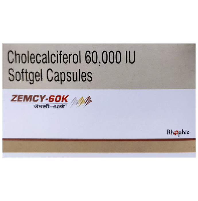 Zemcy 60K Softgel Capsule is used in the treatment of vitamin D deficiency and osteoporosis. It helps the body to absorb calcium. Calcium is essential for maintaining strong and healthy bones. it is used when your diet does not provide enough. Zemcy 60K Softgel Capsule should be taken as directed by your doctor. It is best taken with or after food as this helps your body absorb it and you should take it regularly to get the most benefit. If you are using it to treat osteoporosis you will be prescribed other medicines as well. This medicine may be only part of a complete program of treatment that also includes making changes to your diet and taking calcium and vitamin supplements. Learn about the foods you should eat to make sure you get enough calcium and vitamin D in your diet. Zemcy 60K Softgel Capsule has few side effects and none are common. If you take too much you may feel weakness, muscle pain, or have a metallic taste in your mouth. If experience any such side effects, speak with your doctor. They may be able to help you reduce or treat the symptoms. Before taking this medicine, tell your doctor if you have high levels of calcium in your blood or if you have any heart, kidney, or liver disease. Some other medicines can decrease the absorption of vitamin D3 so let your doctor know all other medicines you are taking to make sure you are safe. This medicine may help during pregnancy when your body needs more vitamin D but too much could harm your baby. Discuss with your doctor.