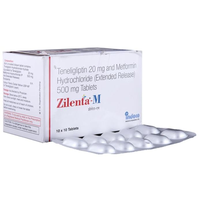 Zilenta-M Tablet ER is a combination of two medicines that control high blood sugar levels in people with type 2 diabetes mellitus. This helps prevent serious complications of diabetes such as kidney damage and blindness and may also reduce your chances of having a heart attack or stroke. Zilenta-M Tablet ER can be prescribed alone or together with other diabetes medications. All diabetes medicines work best when used along with a healthy diet and regular exercise. The dose you are given will depend on your condition, blood sugar levels, and what other medicines you are taking. Taking it with meals helps to reduce the chances of developing an upset stomach. You should take it regularly, at the same time each day, to get the most benefit and you should not stop unless your doctor recommends it. It is controlling your blood sugar levels and helping to prevent serious complications in the future. It is important to stay on the diet and exercise program recommended by your doctor while taking this medicine. Your lifestyle plays a big part in controlling diabetes. The most common side effects of taking this medicine include diarrhea, nausea, vomiting, upset stomach, headache, and sore throat. Low blood sugar level (hypoglycemia) is a possible side effect if you are also taking other diabetes medicines like insulin or sulfonylurea, so you need to know how to recognize and deal with it. This medicine is not suitable for everyone. Before taking it, you should let your doctor know if you have ever had kidney, liver, or heart disease, problems with your pancreas, or if you drink a lot of alcohol. Pregnant or breastfeeding women should also consult their doctor before taking this medicine. Some other medicines can affect this one so tell your doctor about all the medicines you are taking to make sure you are safe. You should try to avoid drinking alcohol as it lowers blood glucose. Your doctor will check your kidney function and blood sugar levels before and during treatment.
