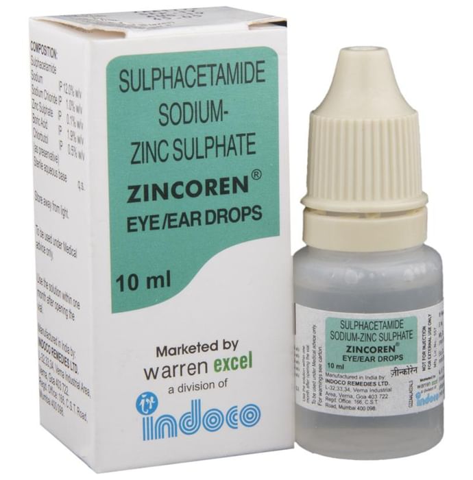 Zincoren Eye/Ear Drops is a medicine used in the treatment of bacterial infections in the eye or ear. It provides relief from itching, irritation, redness, and teary eyes. It also draws out water from the swollen cornea and speeds up the recovery process. Zincoren Eye/Ear Drops is to be used only in the affected eye. Use it in the dose and duration as advised by the doctor. Read the label carefully for instruction before you use the medicine. Wash your hands before using this medicine. Do not use too much or too little. Use it in the exact dose as prescribed by the doctor or as instructed in the label. Use of this medicine may cause discomfort, irritation, and burning sensation immediately on instillation. These are usually temporary and resolve with time. However, if they persist or get worse, inform your doctor. In case of accidental contact with your ears, nose, or mouth, immediately rinse it with water. Inform your doctor if you have a known allergy to any of the ingredients in this medicine or if you are taking any other medication. It is advised not to drive or operate heavy machinery immediately after using this medicine as it may cause temporary blurring of vision and may affect your ability to drive.