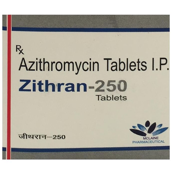 Zithran 250 Tablet is an antibiotic used to treat various types of bacterial infections of the respiratory tract, ear, nose, throat, lungs, skin, and eye in adults and children. It is also effective in typhoid fever and some sexually transmitted diseases like gonorrhea. Zithran 250 Tablet is taken orally, preferably one hour before or 2 hours after a meal. It should be used regularly at evenly spaced time intervals as prescribed by your doctor. Do not skip any doses and finish the full course of treatment even if you feel better. Stopping the medicine too early may lead to the return or worsening of the infection. Commonly seen side effects seen with this medicine include vomiting, nausea, stomach pain, and diarrhea. These are usually temporary and subside with the completion of treatment. Consult your doctor if you find these side effects worry you or persist for a longer duration. Inform your doctor if you have any previous history of allergy or heart problems before taking this medicine. Pregnant or breastfeeding women should consult their doctor before using this medicine.