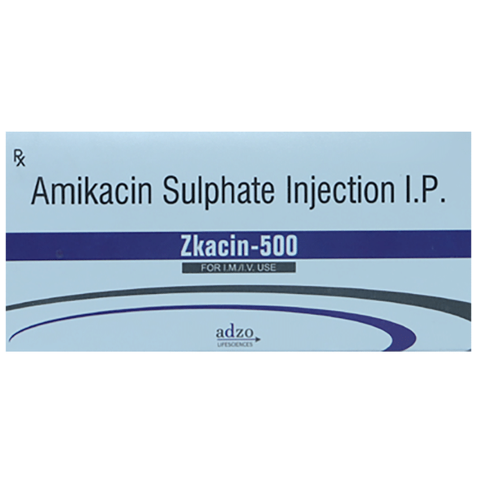 Zkacin 500 Injection is an antibiotic used to prevent or treat a wide variety of bacterial infections. These may include infections of the urinary tract, bones, and joints, lungs (eg. pneumonia), brain, blood, among others. It is also used in hospitalized patients to prevent infections. Zkacin 500 Injection works by stopping the growth of bacteria. It is given as a drip (intravenous infusion) or as an injection directly into a vein or a muscle under the supervision of a healthcare professional and should not be self-administered. It should be used regularly at evenly spaced time intervals as prescribed by your doctor. Do not skip any doses and finish the full course of treatment even if you feel better. Stopping the medicine too early may lead to the infection returning or worsening. Common side effects of this medicine include injection site reactions and increased blood urea. Consult your doctor if any of these side effects persist or if your condition does not improve despite treatment. Some patients receiving high doses may develop balance disorder (loss of balance), kidney damage, and hearing loss. Therefore, please follow all the instructions given by your doctor while using this medicine. Your doctor may also monitor you with regular kidney function tests, hearing tests, and urine tests during treatment. This medication is not recommended for use during pregnancy. Inform your doctor if you are pregnant, planning to conceive, or breastfeeding.