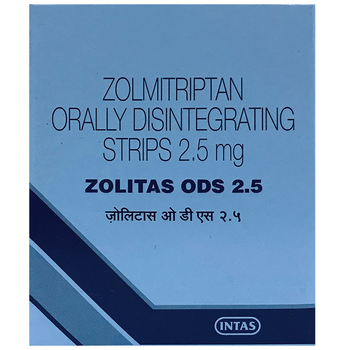 Zolitas ODS 2.5 Strip is used to treat acute migraine attacks. It works by narrowing the blood vessels, thereby relieving migraine headaches and preventing the attack from becoming worse. Zolitas ODS 2.5 Strip may be taken with or without food. Never skip any doses and try to finish the full course of treatment even if you feel better. In case you missed a dose, take it as soon as you remember it. You should continue to take this medicine as long as the doctor advises and do not stop taking it suddenly. Side effects associated with the use of this medicine include dizziness, dryness in mouth, nausea, sensation of heaviness, warm sensation, tightness sensation, cold sensation, drowsiness, fatigue, and peripheral neuropathy (tingling and numbness of feet and hands). It may cause dizziness, do not drive or operate machinery until you know how this medicine affects you. However, these are temporary and usually resolve on their own in some time. Please consult your doctor in case these do not subside or bother you. Consult your doctor if you develop stomach pain, bloody diarrhea, or worsening high blood pressure while taking Zolitas ODS 2.5 Strip. Your doctor may advise for regular eye checkups if you have been taking this medicine for a longer time. In case you experience severe chest pain that does not go away or you have wheezing, breathing problems, or any skin rashes, contact the doctor as soon as possible. This medicine may cause an increase in blood pressure, keep a check on your blood pressure while taking this medicine.