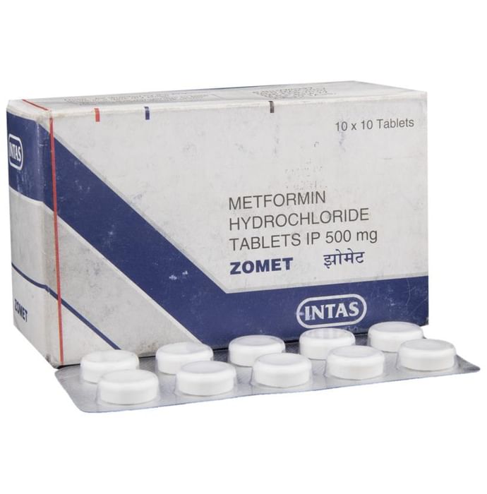 Zomet 500mg Tablet is a medicine used to treat type 2 diabetes mellitus. It helps control blood sugar levels and thus prevent serious complications of diabetes. It is also used to treat a menstruation-related disorder known as Polycystic ovary syndrome (PCOS) in women. Zomet 500mg Tablet is best taken with food to avoid nausea and abdominal pain. You should take it regularly, at the same time each day, to get the most benefit. You should not stop taking this medicine unless your doctor recommends it. Your lifestyle plays a big part in controlling diabetes. Therefore, it is important to stay on the diet and exercise program recommended by your doctor while taking this medicine. The most common side effects of this medicine include nausea, vomiting, taste change, diarrhea, abdominal pain, and loss of appetite. Some people may develop hypoglycemia (low blood sugar level) when this medicine is taken along with other antidiabetic medicines, alcohol, or upon skipping a meal. Monitor your blood sugar levels regularly while taking it. Before taking this medicine, inform your doctor if you have any kidney, liver, or heart problems. Pregnant or breastfeeding women should also consult their doctor before taking it. Your doctor will check your kidney function tests before starting treatment with it. Avoid excessive alcohol intake while taking it as this may increase the risk of developing some side effects.