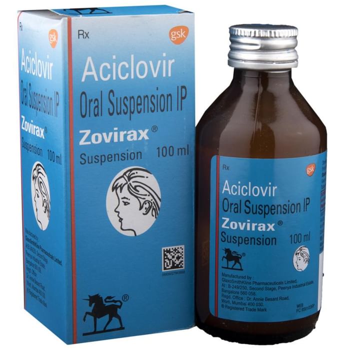 Zovirax Suspension is an antiviral medicine. It helps in treating viral infections like herpes labialis, herpes simplex, shingles, genital herpes infection, and chickenpox. It prevents the multiplication of virus in human cells and therefore helps in clearing the infection. Zovirax Suspension should be taken in the dose and duration as advised by your doctor. Do not skip any doses and finish the full course of treatment even if you feel better. Dissolve it in a glass of water before taking it. It may be taken with or without food, but it is better to take it at a fixed time. If you miss a dose, take it as soon as possible. However, if it is almost time for your next dose, skip the missed dose and go back to your regular schedule. Do not double the dose. You should drink plenty of water while on treatment with this medicine as it helps to prevent dehydration and kidney damage. Some side effects of this medicine include headache, dizziness, vomiting, nausea, fatigue, and fever. Inform your doctor if these side effects do not resolve or persist for a longer duration. Please consult your doctor if you are pregnant, planning to conceive or breastfeeding.