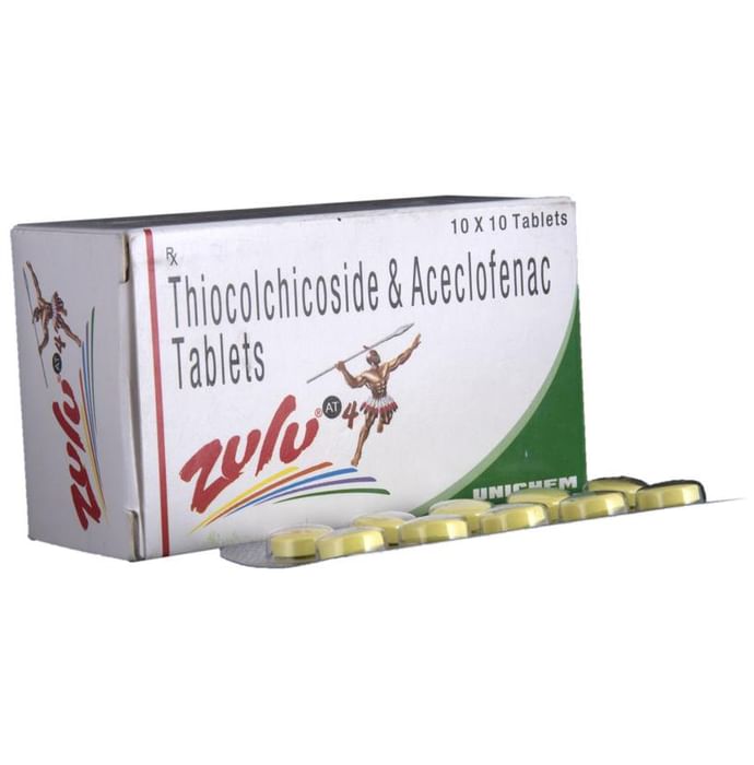 In Treatment of Pain due to muscle spasm Zulu AT 4 Tablet is a combination medicine that contains a painkiller as well as a muscle relaxant. It is used to relieve pain, inflammation, and swelling in conditions that affect muscles. Also, it effectively relieves muscle stiffness or spasm, thereby improving muscle movement. It works by blocking chemical messengers in the brain that tell us we have pain. Take it as it is prescribed to get the most benefit. Do not take more or for a longer duration than needed as that can be dangerous. In general, you should take the lowest dose that works, for the shortest possible time. This will help you to go about your daily activities more easily and have a better, more active, quality of life.