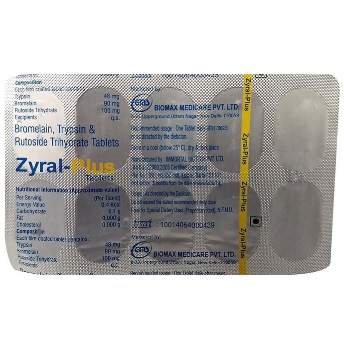 In Pain relief Zyral-Plus Tablet is a combination of medicines used for relief of pain, inflammation, and swelling in conditions that may occur due to trauma, surgery or everyday life. It may also be used to provide relief in degenerative and inflammatory conditions that affect muscles and joints such as rheumatoid arthritis and osteoarthritis. It promotes speedy recovery due to its anti-inflammatory and antioxidant properties. Take it as it is prescribed to get the most benefit. This will help you to go about your daily activities more easily and have a better, more active, quality of life.