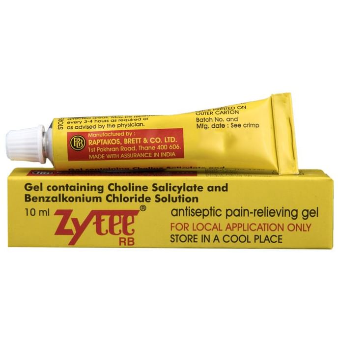 Zytee RB Gel is a pain-relieving medicine. It is used to relieve pain, discomfort, and inflammation caused by mouth ulcers. It is also used to treat cold sores, dentures, and sore spots due to orthodontic devices. Zytee RB Gel is for local application only. Wash your hands thoroughly before and after applying it on the affected area. Please consult your doctor if your symptoms do not get better. It should not be taken by patients who are allergic to it or are less than 16 years of age. It should not be applied to open wounds. Burning sensation and application site reactions might be seen as side effects in some patients.