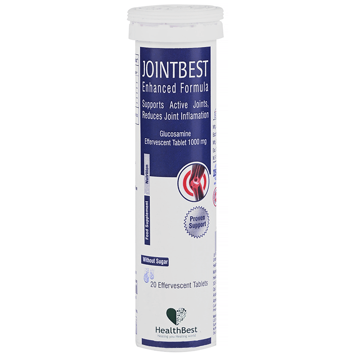 HealthBest Jointbest Glucosamine 1000mg Effervescent Tablet provides three important nutrients which help support healthy joints and connective tissues: glucosamine, chondroitin and methylsulfonylmethane (MSM, from OptiMSM). Glucosamine sulfate helps joint health for joint lubrication, better joint movement, and flexibility. Cartilage, composed of proteoglycans, is mainly located on bones, near the joints and consists primarily of collagen protein with side chains called chondroitin sulfate. MSM supplies bioavailable sulfur needed to support joint health, hair, skin, and nails. OptiMSM is purified via distillation for the highest purity and consistency and is an excellent source of bioavailable sulfur. | Key Ingredients: Glucosamine Sulphate Potassium Chloride | Key Benefits: Glucosamine helps stimulate the manufacture of proteoglycans in healthy joints Chondroitin is a component of healthy joints that attracts water to the tissue, which helps the joint stay elastic and function as a shock absorber for joints MSM (methylsulfonylmethane) is a natural sulfur to help form antioxidants and serve as a key structural nutrient in healthy joints May help to give shape, strength and support to other tissues within the body This combination of ingredients has been proven to support joint structure, function and comfort | Directions For Use: 1 ml for toddlers full of vitamins and minerals, easy to administer with a dropper One teaspoon twice a day or as directed | Safety Information: Read the label carefully before use Keep out of reach of the children Store in a cool dry place