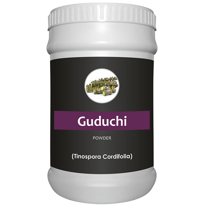 Herb Essential Guduchi (Tinospora Cordifolia) Powder Herb Essential Guduchi Powder contain guduchi (tinspora cordifolia) as its main ingredient. Guduchi is extremely useful in boosting up the function of the defensive white blood cells which are known as macrophages and improves the defence system against various infections. Key benefits of Herb Essential Guduchi Powder: It can be used as diuretic. It is helpful in treating digestive ailments such as hyperacidity, colitis, worm infestations, and loss of appetite, abdominal pain, excessive thirst, and vomiting. It prevent any liver infection. It helps to maintain healthy body temperature, blood sugar and blood pressure levels which are already within normal limits. It also helps to purify blood and provides healthy skin. Direction for use: Take 3 to 5 gm once or twice a day or as directed by the physician. Safety information: Keep out of the reach of children. Use under medical supervision.