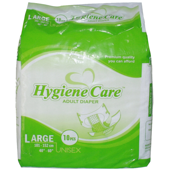 Hygiene Care Adult Diaper is an effective and easy to use diaper for adults that helps prevent leakage and urinary incontinence. These diapers are unisex, disposable and made with super absorbent and comfortable material. | Uses: It is designed to help adults relieve themselves without worrying about leakage when they may not be able to access the restroom as per their need or in case their health does not allow it. | Product Specifications and Features: | Dry surface for cleaner skin: Made of high class non-woven dry surface that will speedily absorb liquid and avoid seepage It will also maintain the dryness of your skin | High-speed channel: With the specially designed linking speed channel, it helps the liquid to spread fast all over the pad and to be absorbed speedily to make the surface dry | Standing inner leak guards: Soft and fitted leakage guards help stop leakage to minimize accidents, thus you can use them far more safely | Wetness indicator: Soft noiseless waterproof back sheet with wetness indicator | Refastening frontal tape: It is good for multiple times of tape applications hence easy to use | Directions For Use: Put both legs in their appropriate opening Fasten frontal tape ensuring a snug fit | Safety Information: After usage, dispose of the diaper properly in the dustbin Read the label carefully before use Store in a safe place and keep out of reach of children