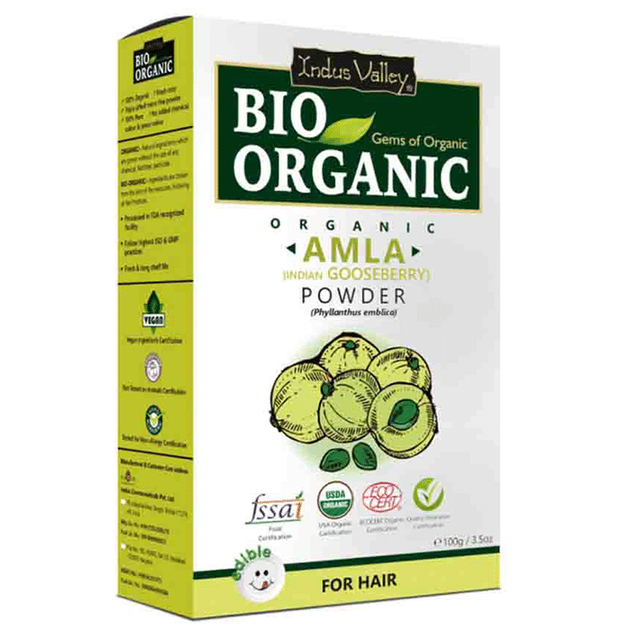 Indus Valley Bio Organic Amla Powder Indus Valley Bio Organic Amla Powder is a blend of elements with depigmentation properties and effectively removes dirt from your face. Amla helps in giving you a clear look by eliminating blemishes and tanning. It also prevents acne formation and deals with pigmentation issues. It is beneficial for your hair as well. It cleanses and revitalises your hair.