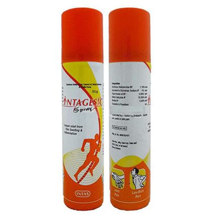 Intagesic Spray Intagesic Spray contains Diclofenac, Linseed oil, Menthol, and Methyl salicylate as active ingredients. - Quick heal formula - Useful in musculoskeletal aches and pains, ache, pain due to soft tissue injuries, back pain, muscle or joint pain and other conditions Key benefits/uses of Intagesic Spray: - Diclofenac is Nonsteroidal anti-inflammatory drugs that help to relieve swelling and pain - Methyl salicylate and menthol provide hot & cold sensation thus enhancing the perception of relief - Provides relief from musculoskeletal aches and pains - Provides instant relief from chilling and throbbing pain - Easily applicable even on tough to reach areas of the body Direction of Use/ Dosage: - Open the cap and press the nozzle two or three times - Directly apply to the affected area - Use twice daily Storage instruction: - Store in a cool, dry and dark place - Protect from the direct heat, sunlight, and moisture Safety information: - Keep out of the reach and sight of children - Avoid contact with eyes - For external use only