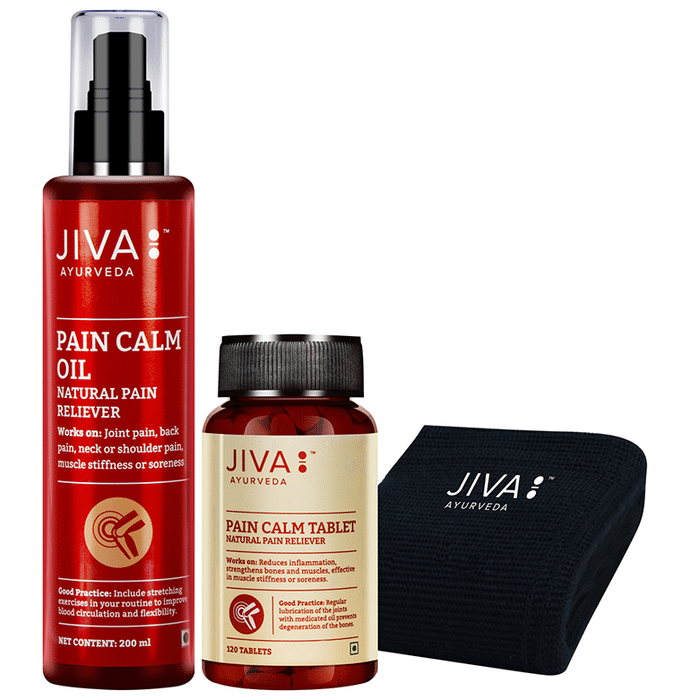 Jiva Ayurveda Combo Pack of Pain Calm Oil 200ml & Pain Calm 120 Tablet with Knee Cap Free is the ideal combo to provide relief from pain and inflammation. Jiva Pain Calm Oil helps patients whose movements are impaired and joints are affected and are in pain. It removes and dissolves the toxins that cause redness, swelling and inflammation. The oil is a combination of ingredients that help to release muscular and nervous tension and further makes sure that proper blood is circulated which eases joint pain and relieves stiffness. Jiva Pain Calm Tablet is made with natural ingredients. It is used to relieve muscular and nerve pain and is also beneficial for joint pain. The knee cap is used to provide additional support to the knee and improve blood circulation. It also protects the knee from further damage. | Key Ingredients: | Jiva Pain Calm Oil: Kapoor Pudina oil Mahanarayan oil Maha Vishagarbha oil Gandhapura oil Prasarni oil Turpentine oil | Jiva Pain Calm Tablet: Boswellia Serrata Curcuma Longa Withania Somnifera Zingiber Officinale | Uses: | Knee Cap: It is primarily used to provide additional support to the knee and protect it from further damage. | Key Benefits: | Jiva Pain Calm Oil: Relieves muscles pain, bloating and inflammation in joints and muscles Provide relief from headache, increases alertness and concentration is boosted Works wonder for joint pain, back pain, muscle pain, neck or shoulder pain and reduce muscle stiffness and soreness Kapoor or camphor oil is a sacred herb used in Ayurveda for healing bronchitis, insomnia, arthritis, sinus and nasal problems | Jiva Pain Calm Tablet: Relieves joint and muscular pain Helps with swelling and inflammation of joints Reduces stiffness and tension Strengthens the bones and muscles | Product Specification and Features: | Knee Cap: Provides additional support to the knee Provides compression to relieve pain Improves blood circulation Protects the knee from the risk of further damage | Directions For Use: | Jiva Pain Calm Oil: Warm the oil and gently apply to the affected parts and massage in a circular motion Massage by applying gentle pressure on the affected areas Keep the area covered with some cloth for better results | Jiva Pain Calm Tablet: Take 1-2 tablets twice daily with water or as directed by a physician. | Knee Cap: Use as directed. | Safety Information: Read the label carefully before use Store in a cool and dry place away from direct sunlight Keep out of reach of the children