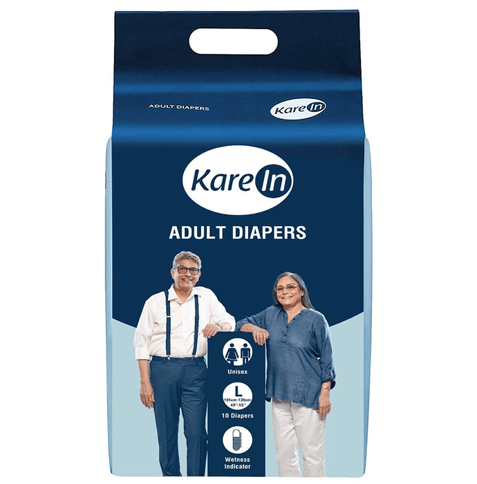 Kare In Adult Diaper Large are created keeping your convenience in mind. It has an extremely soft inside cotton padding that feels like cloth and re-fastenable tapes that can be adjusted for a suitable fit. Its incredibly absorbent gel core keeps you dry and fresh for hours, so you don't have to be concerned about incontinence. It has a distinctive wetness indicator to let you know when it's time to change your diaper. Both men and women will find it to be quite comfortable. It is available in large and medium sizes. | Uses: Kare In Adult Diaper are useful for adults who suffer from the problem of incontinence. | Product Specification and Features: Kare In Adult Diaper are beneficial for senior citizens and individuals with temporary immobility disorders It comes with a special wetness indicator that helps to indicate the time to change the diaper It contains a netted channel for quick liquid absorption and distribution to protect against any leakage It is made from cotton padding that absorbs quickly and provides rash-free skin for the user and contains a re-fastenable tape to fit properly | Directions For Use: Use as directed on the label or as advised by the physician. | Safety Information: Read the label carefully before use Store in a cool and dry place away from direct sunlight Keep out of reach of children