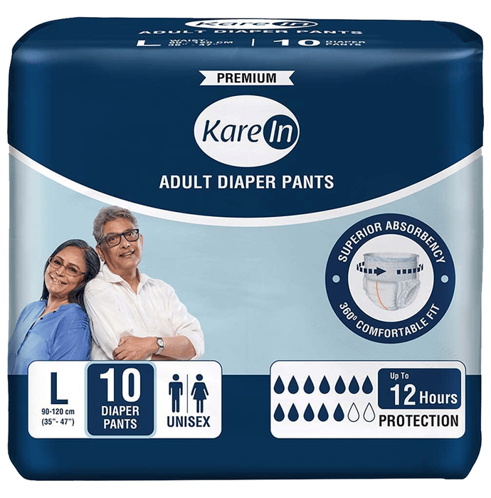 Kare In Adult Pant Style Diapers contains re-fastenable tapes that can be adjusted for a proper fit and a super-soft inside cotton cushioning that feels like cloth. Its super absorbent gel core keeps you dry and fresh for hours, so there's no need to worry about leaks. Its stretch panels mimic cloth for a comfortable fit that feels like actual underwear. | Uses: Kare In Adult Pant Style Diapers are beneficial for senior citizens and patients with mobility issues. | Product Specification and Features: Kare In Adult Pant Style Diapers can be used by the patients who are unable to walk or senior citizens who face difficulty in urine sensation It contains re-fastenable tapes that help to adjust the diaper as per body shape It contains an absorbent gel core that swiftly seals fluids away and aids in odour elimination | Directions For Use: Use as directed on the label or as advised by the physician. | Safety Information: Read the label carefully before use Store in a cool and dry place away from direct sunlight Keep out of reach of children