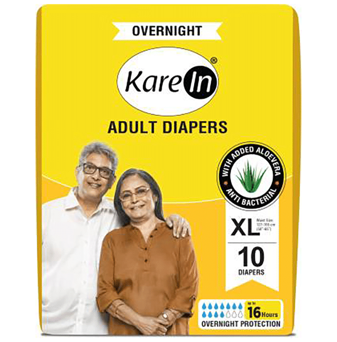 Kare In Overnight Adult Diaper XL Kare In Overnight Adult Diaper Medium is beneficial for nighttime protection against leakage and bacterial infection. It has a diffusion layer that increases fluid diffusion, as well as leg cuffs that give a secure fit and prevent leaks. It also has aloe vera extract in it, which protects the skin from irritation, rashes, and redness. It is available in medium, large and XL sizes.
