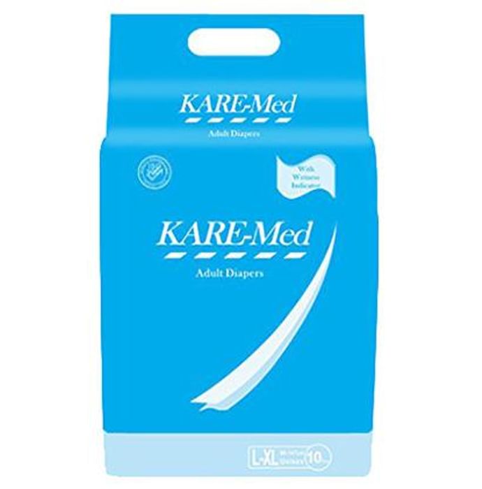 Kare-Med Adult Diaper L-XL Kare-Med Adult Diaper Medium is useful for both men and women who are unable to walk or have mobility problems. It is made from a soft cotton sheet that does not cause any rashes and provides a soft and comfortable feel. It has a very absorbent gel core that aids in swiftly locking liquids in place, and its leg cuffs prevent leaks. It also features resealable tapes to ensure that diapers fit properly without causing pain to the user. It is available in medium, large, XL and L-XL sizes.