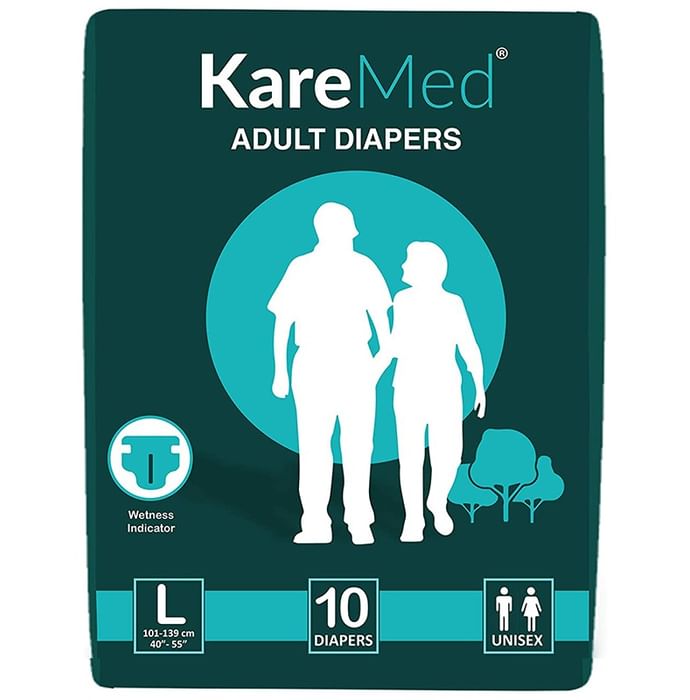 Kare-Med Adult Diaper Large Kare-Med Adult Diaper Medium is useful for both men and women who are unable to walk or have mobility problems. It is made from a soft cotton sheet that does not cause any rashes and provides a soft and comfortable feel. It has a very absorbent gel core that aids in swiftly locking liquids in place, and its leg cuffs prevent leaks. It also features resealable tapes to ensure that diapers fit properly without causing pain to the user. It is available in medium, large, XL and L-XL sizes.