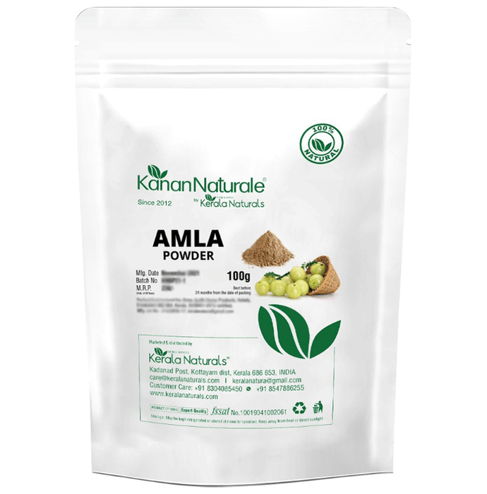 Kerala Naturals Organic Amla Powder Kerala Naturals Organic Amla Powder is a 100% pure Organic with no chemicals in it. It is known to be very popular and has many applied benefits and medical value. Applying Amla powder on skin and hair helps in the reduction or prevention of acne and pimples. It also provides strength to the hair and enhances hair roots and provide them a colour texture. It is easily available and can be used to purify the blood to give shiny hair. It is mainly used as hair toner and improves hair pigmentation.