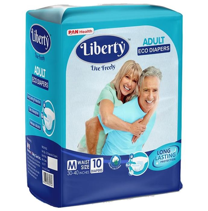 Liberty Eco Adult Diaper is made with extra soft materials. Its underwear like shape with additional supporting elastics gives freedom of mobility. It comes with the extra absorbent slim core stabilized with fluid distribution channesl. | Uses: It is used to provide comfort in the condition of adult incontinence. | Product Specifications and Features: Designed with cotton like material for comfortable feel Comprises of fluid distribution channel which helps to distribute fluid evenly Embodies refastenable tapes which allows easy refastening for mutiple adjustments Consists of 3D core technology which promotes greater absorption in target area Comes with a wetness indicator which alerts when the diaper is wet | Directions For Use: Use as per requirement or as directed by the physician. | Safety Information: Read the label carefully before use Store in a cool dry place away from direct sunlight Keep out of reach of the children Avoid physical damage