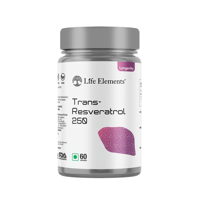 Life Elements Trans-Resveratrol 250 Vegetable Capsule Trans-Resveratrol is a polyphenol that can be discovered in a wide variety of plants, notably in grapes, wines, as well as peanuts. Trans-Resveratrol has anti-oxidant as well as anti-inflammatory properties, and also the ability to influence the expression of genes for a variety of molecular substrates. | Key Ingredients Trans resveratrol | Key Benefits: It reduces the formation of free radicals and increases insulin sensitivity It prevents metabolic errors and may help in neuroprotective activities It controls inflammation and prevents chronic diseases It may also prevent the formation of tumours and improves metabolism It is soy-free, gluten-free, sugar-free, GMO-free, and dairy-free and is made of vegan vegetable capsule shells | Directions For Use: Once a day, after your first meal, along with a glass of water Younger individuals can also take it 6 hours after waking up | Safety Information: Store in a cool and dry place away from direct sunlight Read the label carefully Keep out of reach of children Use under medical supervision Don’t exceed the recommended dosage