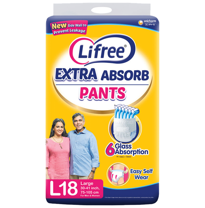 Lifree Extra Absorb Pants is specially designed to help the elderly or anyone who is bed ridden and thus may not be able to use the bathroom as and when they want to. It comes with a powerful absorbent sheet that prevents leakge and helps them function with maximum comfort. It is available in three different sizes, namely, Large, Medium and Extra large. | Uses: It is specially designed with a powerful absorbent sheet that helps in preventing any leakage from happening. With an elastic waist band it is very comfortable and easy to wear or take off. | Product Specifications and Features: It comes with a powerful absorbent sheet that will prevent the chances of leakage It has a soft leg Passage that is very comfortable and gentle on the skin Consists of a flexible waist band making it easier to pull the pants up and down Available in different sizes: L, M and XL It gives 8 hour protection | Directions for Use: Read the leaflet or manual. ‾ Safety Information: Read the label carefully before use Keep out of the reach of children Store in a cool dry place away from direct sunlight and heat