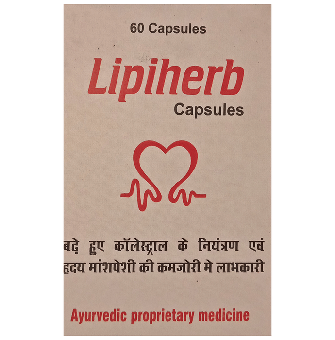 Lipiherb Capsule is an Ayurvedic medicine to normalize cholesterol levels and maintain healthy cardiovascular functions. It is useful in the prevention and treatment of raised lipid levels and their complications. | Key Ingredients: Arjun Extract Lahsun Extract Tulsi Extract Guggulu Extract Apamarg Extract Shalmali Extract Shuddh Shilajeet Methi Extract | Key Benefits: It controls blood pressure It increases HDL levels in blood It is useful in hypercholesterolemia, dyslipidemia and hyperlipidemia | Directions For Use: Use as directed. | Safety Information: Read the label carefully before use Store in a cool and dry place away from direct sunlight Keep out of reach of the children