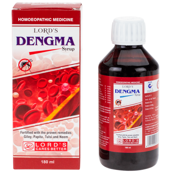 Lord's Dengma Syrup Lords Dengma Syrup helps you to fight against dengue by checking the replication of dengue virus, boosting immune system, and increasing platelet count, white blood cells and neutrophils, this homoeopathic medicine is generally indicated for sudden high fever due to dengue, severe headache, joint and muscle pains, vomiting, and pain around the eyes.