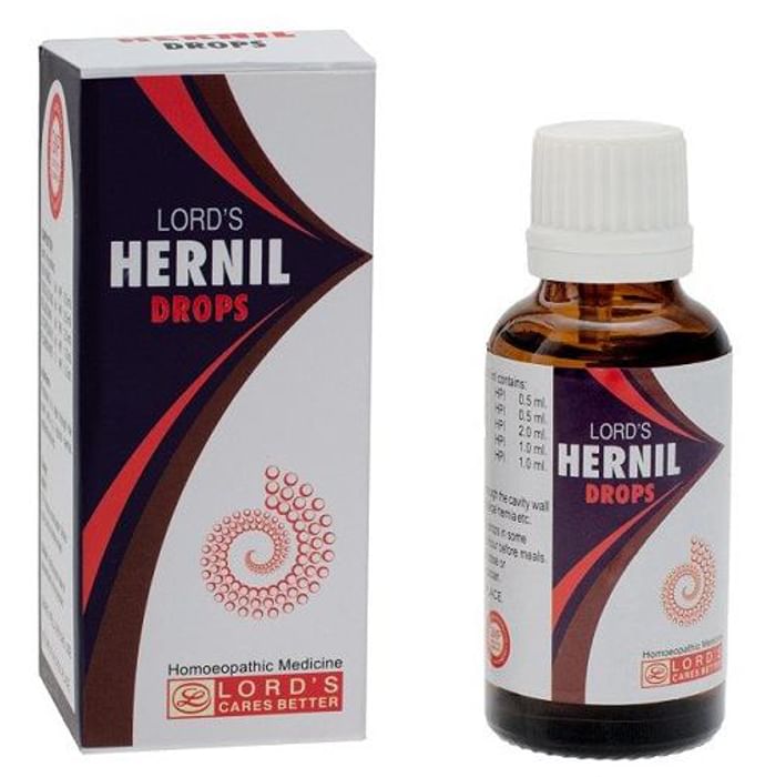 Lord's Hernil Drop Lords Hernil Drop checks all complications and treats all hernias in the early stages to avoid strangulation and the resultant surgery. It also assists in treating cramp like pain and spasmodic contraction in spermatic cord.