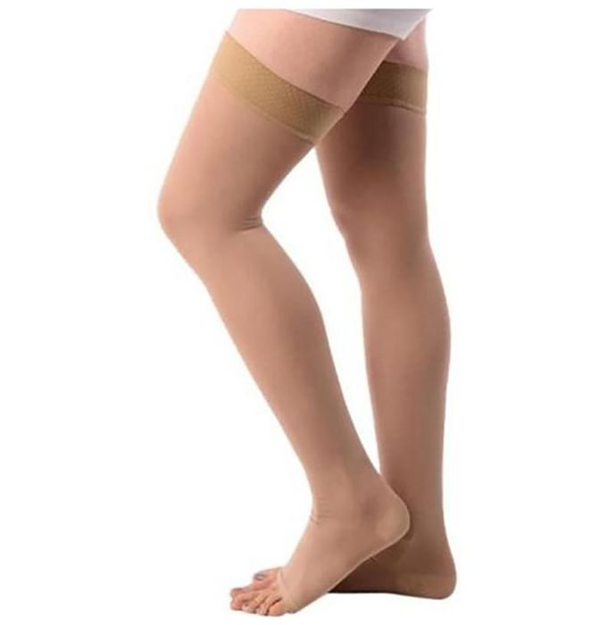 Maxis Cotton Thigh Length Stocking Small Beige Maxis Cotton Thigh Length Stocking provides the wearer a flexible and comfortable fit which makes the stockings remain in correct position and in place without constricting skin and leg. The compression at the at the ankle is more and it reduces gradually upwards the leg part to promote healthy circulation and keep you feeling energized. It is available in varied sizes giving the customer a wide range of options to choose from depending on their size and comfort. These sizes are extra small, small, medium, large, extra large, XXL, XXXL, and XXXXl.