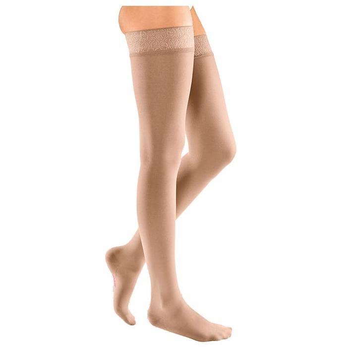 Medi Duomed Thigh Length Stocking is constructed with latex free material and provides relief in Varicose veins. It encompasses Silicone topband which aims to prevent an allergic reaction. | Uses: The product is primarily used in the case of primary or secondary varicosis and varicose veins in pregnancy. | Product Specifications and Features: The product is helpful in the case of Primary or secondary varicosis, Varicose veins in pregnancy, supporting sclerotherapy, after varicose vein surgery It is a daily wear for gentle care The item is latex free It consists of Silicone topband and thus does not cause an allergic reaction It is designed with British Standard elastic hosiery It assist in the treatment of deep venous thrombosis, condition after thrombosis, post-thrombotic syndrome In addition to this, it comes in five different variants namely, Beige- S, M, L, XL, XXL | Directions For Use: Use as per requirement or as directed by the physician. | Safety Information: Read the label carefully before use Store in a cool dry place away from direct sunlight Keep out of reach of the children Avoid physical damage