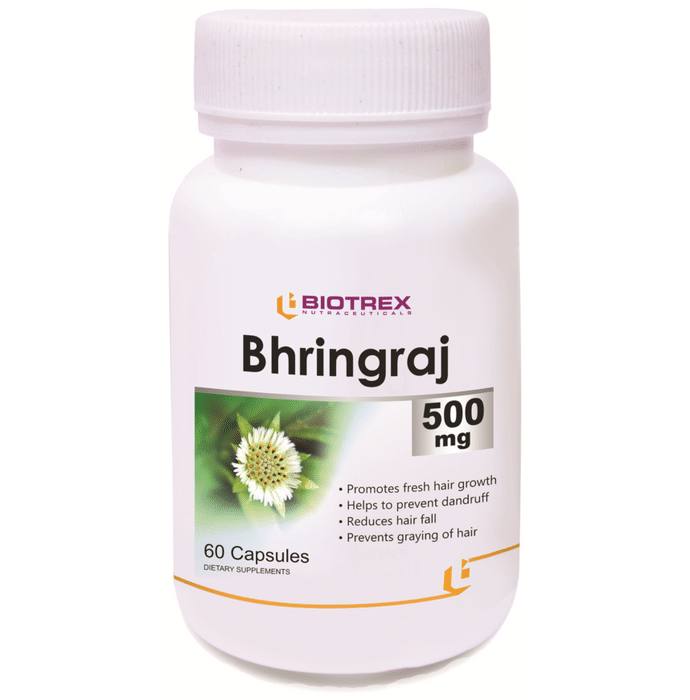 Biotrex Bhringraj 500mg Capsule Biotrex Bhringraj 500mg Capsule provides nourishment to hair and overall body. It helps restore youthful colour and shine to hair, as well as encourage its regrowth. Biotrex Bhringraj 500mg Capsule contains a rich amount of protein and can revitalize hair and fight premature greying, prevent scalp infections and hair fall, strengthens the hair roots, conditions the hair well, prevents split ends and baldness, and promotes hair growth.