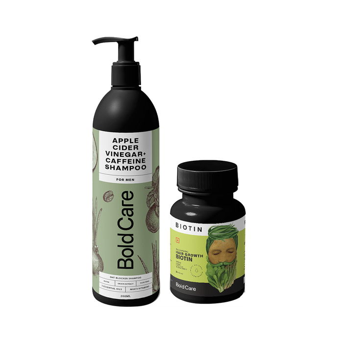 Bold Care Hairfall Control Pack is a complete package for hair health. Bold Care's DHT Blocker shampoo has ingredients like Biotin, Caffeine, Vitamin E, Vitamin B5, and other essential oils that have been known to block the production of DHT, which helps reduce hair fall, nourish scalp and aid natural hair growth. Bold Care's Biotin tablets are a natural source of vitamin B7, A, B6, E, C and D3 that are known to strengthen hair growth, reduce thinning, and promote natural shine and volume. Biotin is known to aid in the faster regrowth of hair. | Key Ingredients: | DHT Blocker Shampoo: Aloe Vera Extract Apple Cider Vinegar Extract Onion Juice Extract Stinging Nettle Extract Rosemary Extract Lavender Extract Argan Oil Almond Oil Biotin Niacin Vitamin B5 Vitamin E Caffeine | Bold Care Biotin: Aloe Vera Extract Zinc Vitamin C Vitamin E Vitamin A Vitamin D3 Niacin Vitamin B6 Folic Acid Biotin | Key Benefits: | DHT Blocker Shampoo: It is a DHT blocker shampoo that helps reduce hairfall It promotes hair growth Aloe vera calms the itchy scalp and acts as antifungal It promotes shiny and healthy hair growth Apple cider vinegar and essentials oils help get rid of dandruff completely | Bold Care Biotin: It helps minimize hairfall It strengthens the hair It reduces brittleness and strengthens fingernails | Directions For Use: | DHT Blocker Shampoo: Wash your hair daily with shampoo. | Bold Care Biotin: Take 2 tablets daily, 1 after breakfast and 1 after dinner. | Safety Information: Read the label carefully before use Store in a cool and dry place away from direct sunlight Keep out of reach of the children
