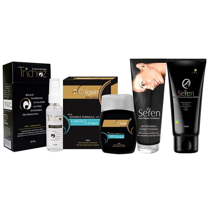 Seren Extra Mild Shampoo (Ethicare Remedies) | Seren Extra Mild Shampoo gently cleanses hair leaving it silky, smooth and bouncy. It protects the hair from harmful UV rays. It makes the hair smooth as well as frizz-free and it helps in detangling hair. As Seren extra mild shampoo is very gentle, it can be used daily and regularly for better results. | Key Ingredients: Sodium Laureth Sulphate Glycerine Aloe vera extract | Key Benefits: It is specially formulated to help make the hair stronger, to clean the scalp and also to inhibit hair fall It is comprised of root stimulating peptides which aid hair growth It protects the hair from harmful rays of the sun It helps in detangling hair and making it frizz-free | Directions For Use: Directly apply to wet hair, massage into scalp. Lather and rinse thoroughly. Repeat if desired. Use regularly for best results. Avoid contact with eyes and if it happens rinse immediately. | Safety Information: Read the label carefully before use Store in a cool dry place away from direct sunlight Keep out of reach of the children Trichoz Hair Serum (Ethicare Remedies) | Trichoz Hair Serum is a leave-on hair serum for dry, tangled, frizzy, unmanageable hair and is ideal for preventing hair loss, thus promoting hair growth. It helps to treat split ends. Trichoz serum is based on a non-sticky formula and is suitable for all age groups. It is compatible with all hair growth treatments. Trichoz serum has a unique hair fibre sealing property that strengthens each hair strand. It gives a bouncy, silky, glossy, smooth, shiny look to your hair. The UV filter protects hair from UV damage. Antioxidants protect hair from oxidative damage and minimize the damage done by chemical or mechanical treatment. | Key Ingredients: Vitamin E Dimethicone crosspolymer | Key Benefits: It gives a bouncy, silky, glossy, smooth, shiny look to your hair It helps in minimising damage caused to hair due to chemical treatments, free radicals or environmental pollutants The UV filter protects hair from UV damage It has a unique hair fibre sealing property that strengthens each hair strand | Directions For Use: Use as directed on the label. | Safety Information: Read the label carefully before use Store in a cool dry place away from direct sunlight Keep out of reach of the children Foligain Hair Lotion (Ethicare Remedies) | Foligain Hair Growth Lotion is a clinically proven formula to revitalize your hair growth effectively as it enriched with high-quality ingredients like saw palmetto, L-arginine. It helps in strengthening hair strands from the root. Regular use of Foligain helps you to fight against the problem of hair loss. | Key Ingredients: L- Arginine Anagain Saw Palmetto Nettles Leaf Extract Planoxiarg Papain Extract Biotin Aloe Barbadensis (Aloe Vera) Ginseng Root Extract Jatamansi Bhringraj Amla Pumpkin Seed Oil Carrot Oil | Key Benefits: Helps to strengthen the hair follicles Helps to prevent the breakage of hair It can be used to treat male and female pattern baldness It helps in preventing hair loss | Directions For Use: Use as directed on the label. | Safety Information: Read the label carefully before use Store in a cool dry place away from direct sunlight Keep out of reach of the children Seren Nutri-Repair Conditioner (Ethicare Remedies) | Seren Nutri-Repair Conditioner is extremely helpful for dry, tangled, frizzy, unmanageable hair. It is useful in treating hair fall. Having unique hair fibre sealing property, it strengthens each hair strand. It helps to treat split ends. | Key Ingredients: Cetyl alcohol Cyclomethicone Dimethicone Shea butter Vitamin E | Key Benefits: Makes the hair look shinier and softer Helps to prevent hair fall and strengthens the hair Helps to condition the hair It is useful in treating split ends | Directions For Use: Use as directed on the label. | Safety Information: Read the label carefully before use Store in a cool dry place away from direct sunlight Keep out of reach of the children