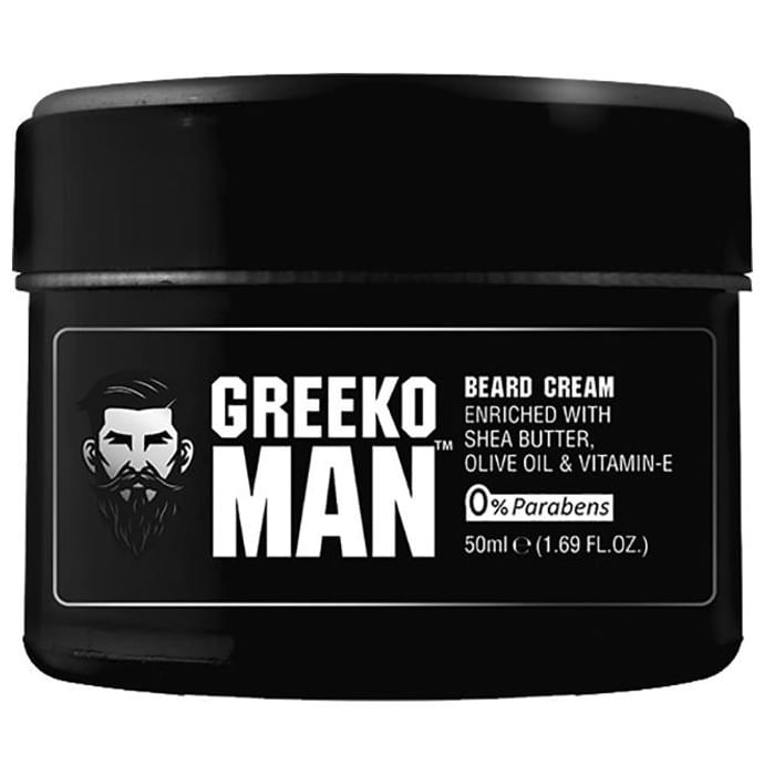 Greeko Man Beard Cream is a hydrating beard cream that makes the beard feel soft and smooth. It moisturises and strengthens the hair and can be used for styling the beard. | Key Ingredients: Shea butter Olive oil Vitamin E | Key Benefits: It nourishes and softens the beard It tames the beard and helps in styling it It moisturises the beard and makes it soft It helps strengthen the hair and promotes hair growth | Directions For Use: Use as directed on the label | Safety Information: Read the label carefully before use Store in a cool and dry place, away from sunlight Keep out of reach of children