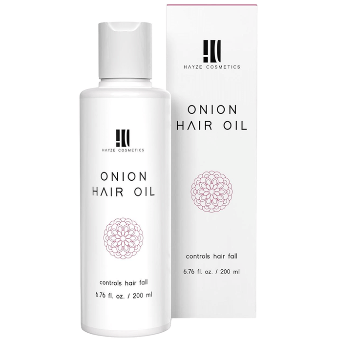 Hayze Cosmetics Onion Hair Oil Hayze Cosmetics Onion Hair Oil is infused with onion oil, olive oil, jojoba oil, vitamin E oil, coconut oil, and hibiscus oil which helps to control hair fall and promotes growth and nourishing your damaged hair. This non-greasy oil is made through an Ayurvedic process for effective results. Regular use gives you natural healthy hair. The bioactive compounds in castor oil lessen hair thinning and breakage and add volume and strength to the hair.
