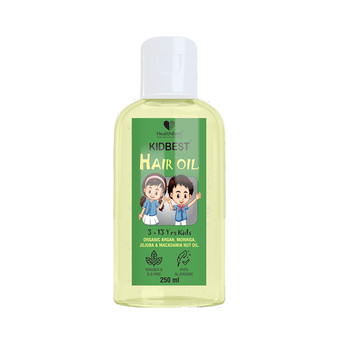 HealthBest Kidbest Hair Oil 3 to 13 yrs Kids HealthBest Kidbest Hair Oil is made with organic argan, moringa, jojoba and macadamia nut oil to add shine and condition your hair throughout the day, leaving it soft and manageable by adding strength to help avoid snaps and breaks. It is specifically designed to be milder than adult hair products. This hypoallergenic conditioning spray is sulphate, paraben, phthalate and dye-free, making it gentle on toddlers' and kids' developing hair. It is ideally used for 3 to 13-year-old kids.