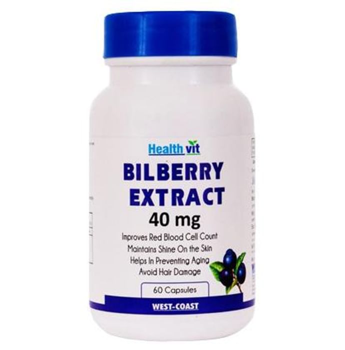 HealthVit Bilberry Extract 40mg Capsule Healthvit Bilberry extract 40mg capsule contains bilberry extract (Vaccinium myrtillus) and anthocyanosides. Key benefits of Healthvit Bilberry extract 40mg capsule: Provides excellent anti-oxidant support in the body and support vision health. Direction for use: As a Dietary supplement for adults, take 1 or 2 capsules daily preferably at meal time or as directed by health practitioner. Safety information: Pregnant, nursing women or individual taking any medications, consult the doctor before use. No artificial color, flavors or preservative added, no chemical solvents. Use under medical supervision.