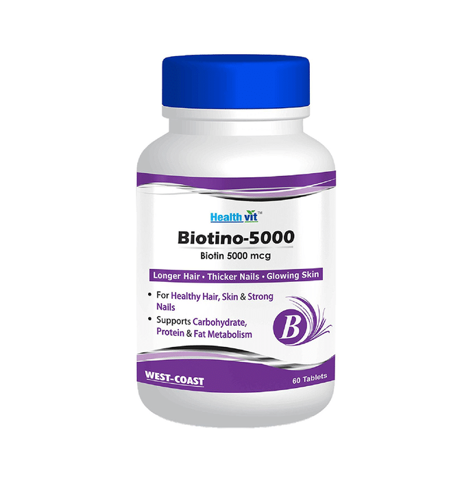 HealthVit Biotino 5000mcg Tablet Healthvit Biotino Tablet contains the nutrients important for the growth and maintenance of hair, nails and glowing skin. It supports the breakdown of fatty acids into energy for the body. It helps in the action of enzymes that affect the skin and intestinal tract.
