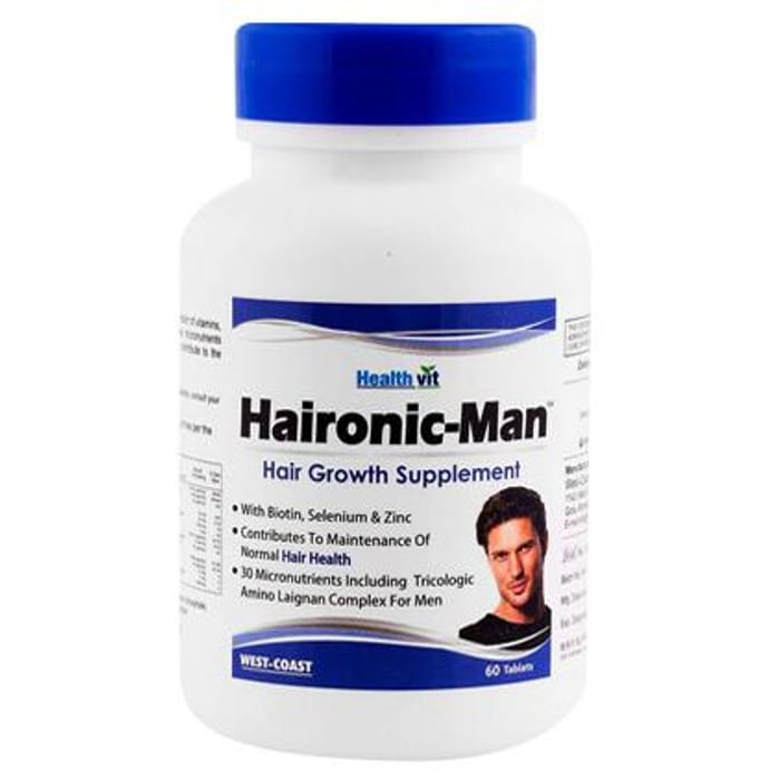 HealthVit Haironic-Man Tablet Healthvit Haironic-Man Tablet contains calcium carbonate and Di basic calcium phosphate as its main ingredient. It is a carefully balanced combination of vitamins, minerals & bio-active nutrients. It provides micro nutrients including biotin, selenium, and zinc which contribute to the maintenance of normal hair. Key benefits of Healthvit Haironic-Man Tablet: It contributes to the maintenance of normal hair health. It offers 30 micro nutrients including tricologic amino laignan complex for men. The direction of use: Take one or two tablets daily or as per the requirement. Use under medical supervision.
