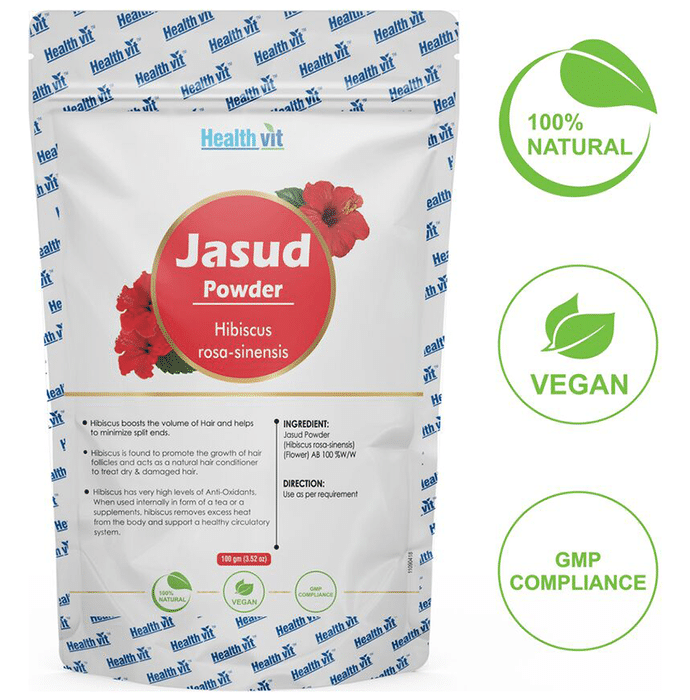 HealthVit Natural Jasud (Hibiscus rosa-sinensis) Powder Helthvit Jasud powder contains jasud (Hibiscus rosa-Sinensis) as its active ingredients. key benefits of Healthvit Jasud powder: It helps and prevents the premature greying of hair when used as a hair oil or hair pack. Hibiscus is known to combat hair loss and hair fall in men and women. Hibiscus is good for all skin types and does no harm. Hibiscus makes the hair roots and strands stronger. It conditions the hair mildly and keeps them bouncier. Direction for use: Mix 1 teaspoonful of powder in 200ml of water or as directed by the physician. Safety information: Pregnant or lactating women are advised to consume herbal products under the advice of the physician. No artificial colour, flavors or preservatives added, no chemical solvents. keep out of reach of children. Use under medical supervision.