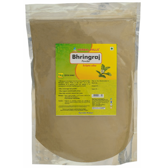 Herbal Hills Bhringraj Powder Herbal Hills Bhringraj Powder contains Bhringraj (Eclipta Alba) as the active ingredient. Key benefits/uses of Herbal Hills Bhringraj Powder: Role of Bhringraj (Eclipta Alba): - Acts as the general tonic for debility - Possess hepatoprotective properties - Encourages hair growth and supports the overall health of hair - Delays premature graying of hair and beneficially used for the treatment of wounds - Useful in the cough treatment - Provides relief from the swelling and pain - Useful in the treatment of a toothache, piles and ear infection - Also used in treating migraine and sinusitis - Beneficial for the treatment of jaundice, and cirrhosis - Effective in treating stomach ache, insomnia and high blood pressure Direction for use /Dosage: - Take 3 gm of Herbal Hills Bhringraj Powder, 1 to 2 times a day or as directed by the physician Safety information: - Read the label carefully before use - Do not exceed the recommended dose - Keep out of the reach and sight of children