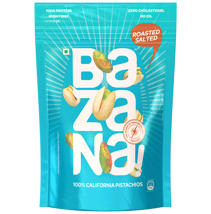 Bazana 100% California Roasted Salted Pistachios Bazana 100% California Roasted Salted Pistachios is a good source of protein, dietary fibre and helps to nourish the body. It is useful in lowering bad cholesterol content and helps fight the signs of premature ageing of skin. It also facilitates the process of weight loss.