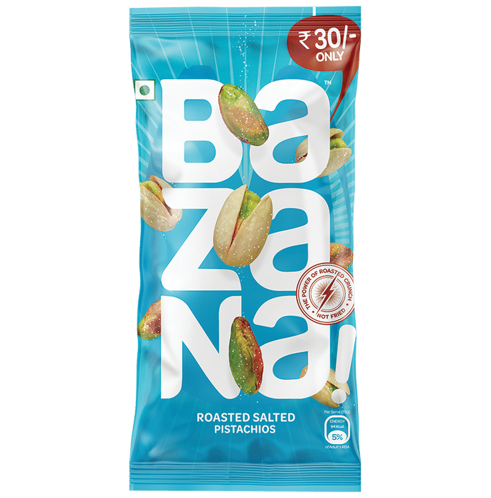 Bazana Roasted Salted Pistachios is a good source of protein, dietary fibre and helps to nourish the body. It is useful in lowering bad cholesterol content and helps fight the signs of premature ageing of skin. It also facilitates the process of weight loss. | Key Ingredients: Pistachios | Key Benefits: It has an abundance of antioxidants It may help in improving vision It helps delay the appearance of signs of ageing It helps lower bad cholesterol content Warranty : 09 months | Directions For Use: Use as directed on the label. | Safety Information: Read the label carefully before use Store in a cool dry place away from direct sunlight Keep out of reach of the children