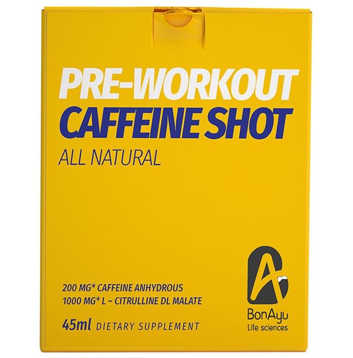 BonAyu Pre Workout Caffeine Shot (50ml Each) Sugar Free BonAyu Pre Workout Caffeine Shot (50ml Each) Sugar Free are small caffeine shots especially made for fitness lovers to go the extra mile during their run and performance. The BonAyu Pre-Workout Caffeine Shots are butterscotch flavoured shots with Citrulline D Malate and Vitamin B6 ideal for a boost of energy within seconds.