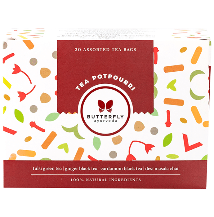 Butterfly Ayurveda Assorted Tea Poutpourri (2gm Each) is a 4-in-1 tea combo that contains tulsi green tea, ginger black tea, cardamom black tea and desi masala chai. Tulsi tea is a natural blend of dried tulsi and Darjeeling green tea leaves. Ginger black tea comes with the goodness of dried ginger and black tea leaves. Cardamom black tea is a natural blend of cardamom and Assam black tea leaves. Desi masala chai is a mix of cardamom, ginger, cinnamon, kali mirch and Assam black tea leaves (CTC). This tea collection comes with 20 assorted tea bags. | Key Ingredients: Tulsi green tea Ginger black tea Cardamom black tea Desi masala chai | Key Benefits: Tulsi tea helps boost immunity and has a relaxing effect on the mind and body, and helps pacify Kapha and Vata doshas Ginger black tea helps remove congestion associated with the common cold and is a rich source of flavonoids Cardamom black tea is a rich source of antioxidants and helps pacify Vata and Pitta doshas Desi masala chai helps to rejuvenate the body and soothes the throat | Directions For Use: Use as directed on the label | Safety Information: Read the label carefully before use Store in a cool and dry place, away from sunlight Store in an airtight container after opening